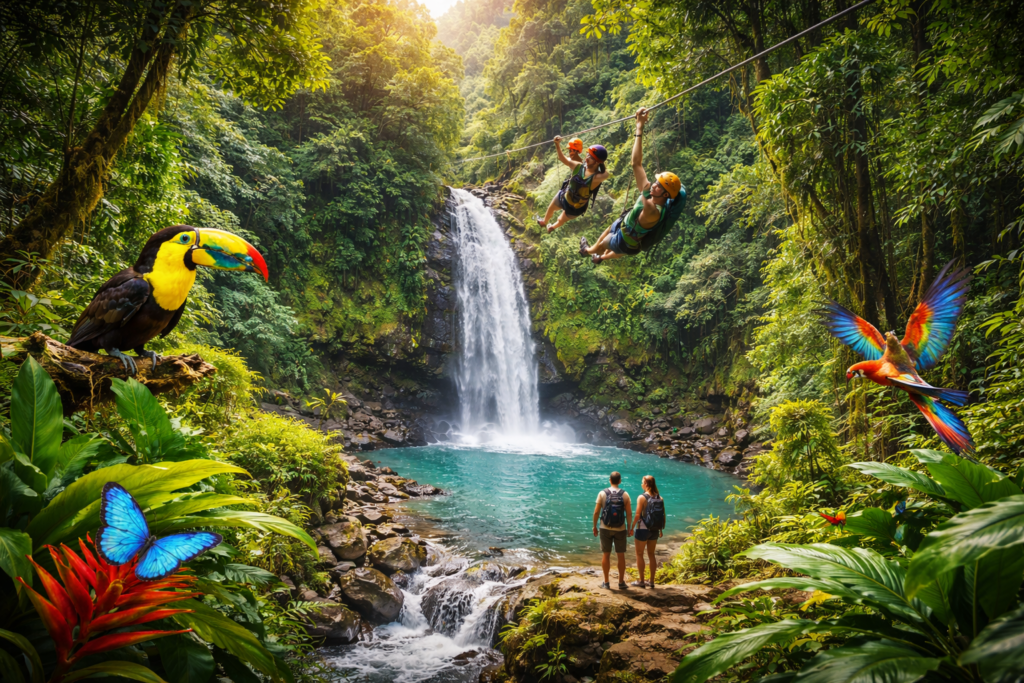 Travelers can experience zip-lining through forests, wildlife safaris, volcano hiking, and surfing along the Pacific coast.